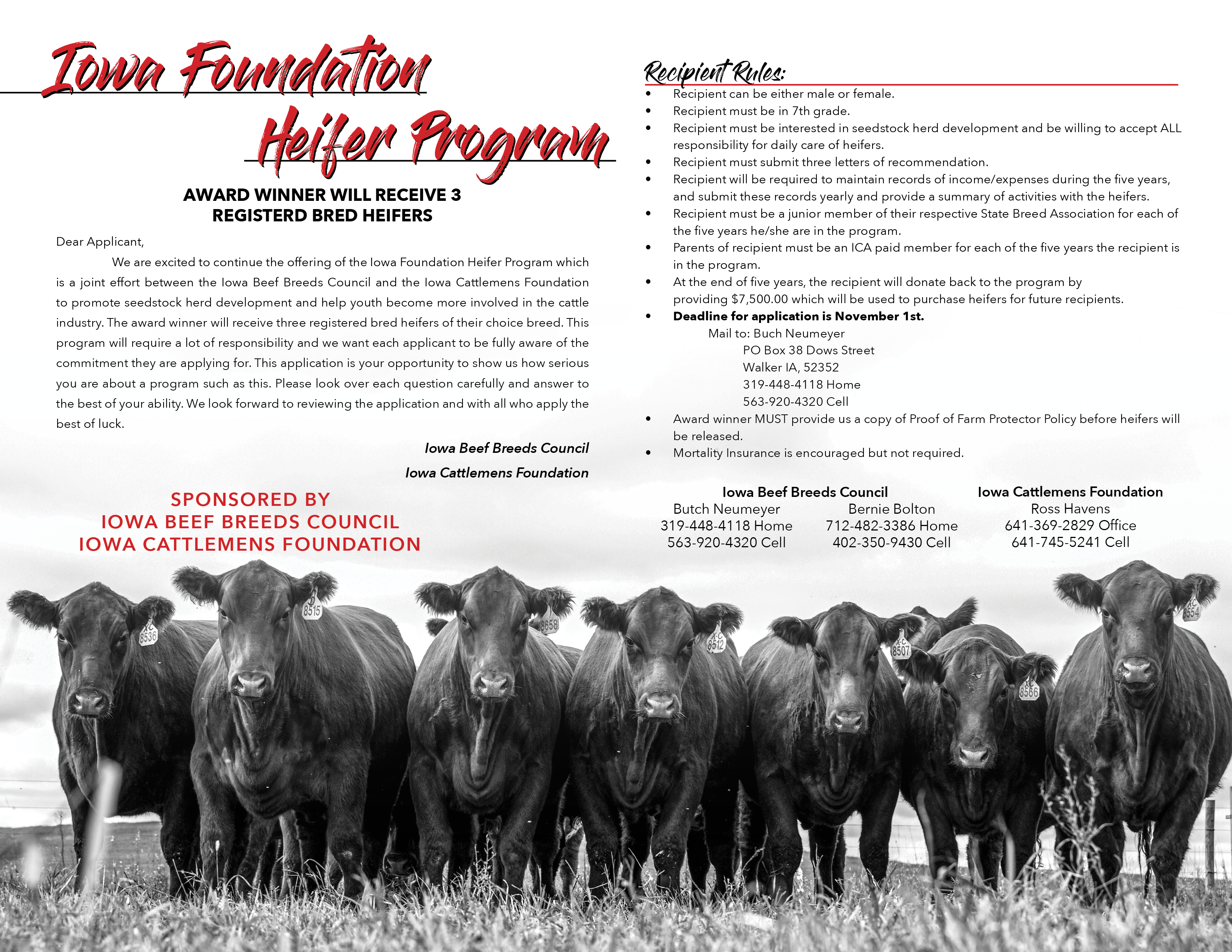 The Iowa Foundation Heifer Program is a joint effort between the Iowa Beef Breeds Council and the Iowa Cattlemen's Foundation to promote seedstock herd development and help youth become more involved in the cattle industry.